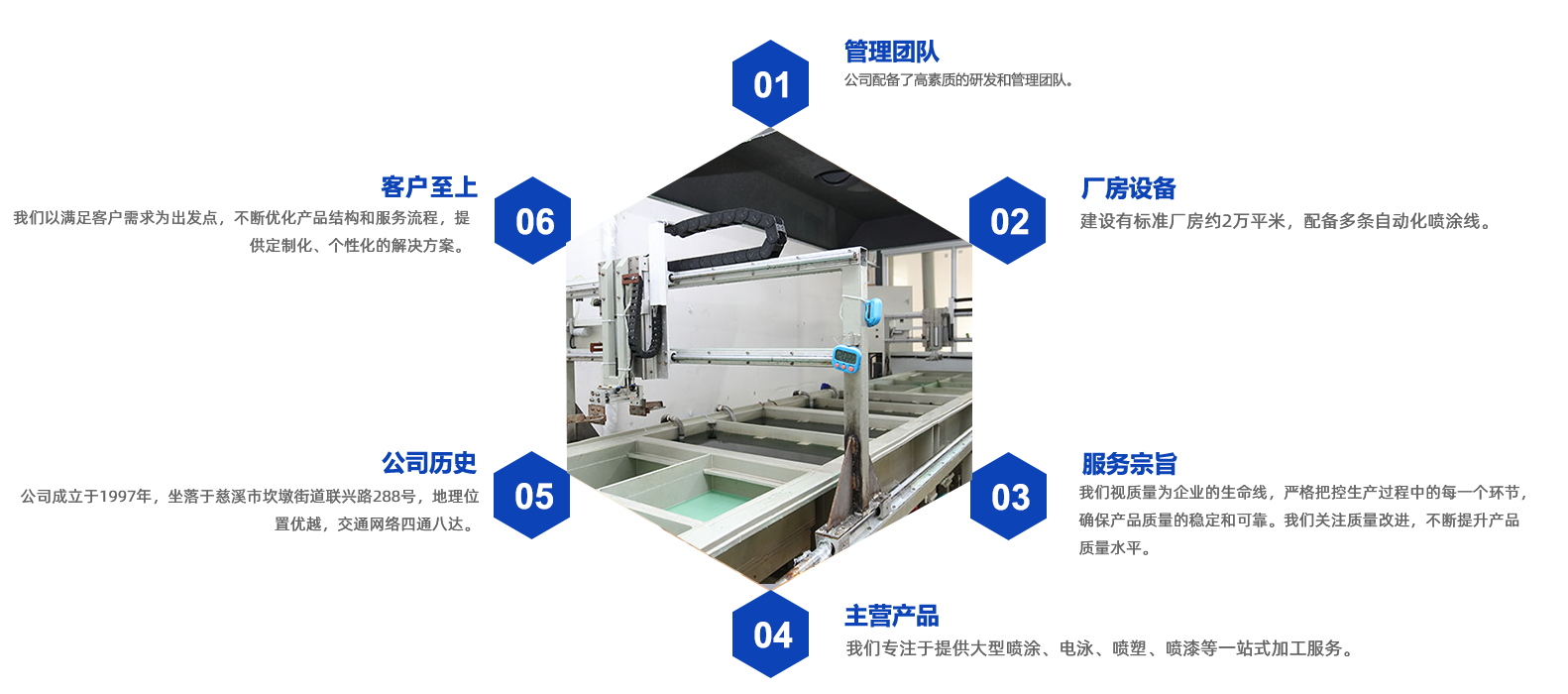 慈溪市坎墩镇舒丽喷涂厂成立于1997年,坐落于风景秀丽的杭州湾大桥南岸慈溪市坎墩街道联兴路288号,地理位置优越,交通网络四通八达。作为金属表面涂装领域的佼佼者,我们专注于提供大型喷涂、电泳、喷塑、喷漆等一站式加工服务。 舒丽喷涂厂,凭借先进的工艺技术和严格的质量管理,赢得了客户一致好评。我们专注于金属件、五金配件、塑钢门窗配件等不同金属五金件的喷塑、电泳漆喷涂等加工服务。我们的产品种类繁多,价格公道,深受广大客户的青睐。